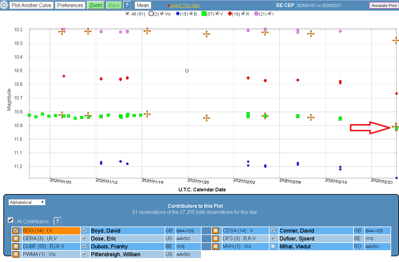 Brightness of EE Cep determined by you on evening on 28th of Feb 2020 is valuable. Your DSLR value is Tri-V ~ 10,941 mag, while other observers a little bit earlier determined brightness in the filter Johnson-V ~ 10,932 -10,933 mag.