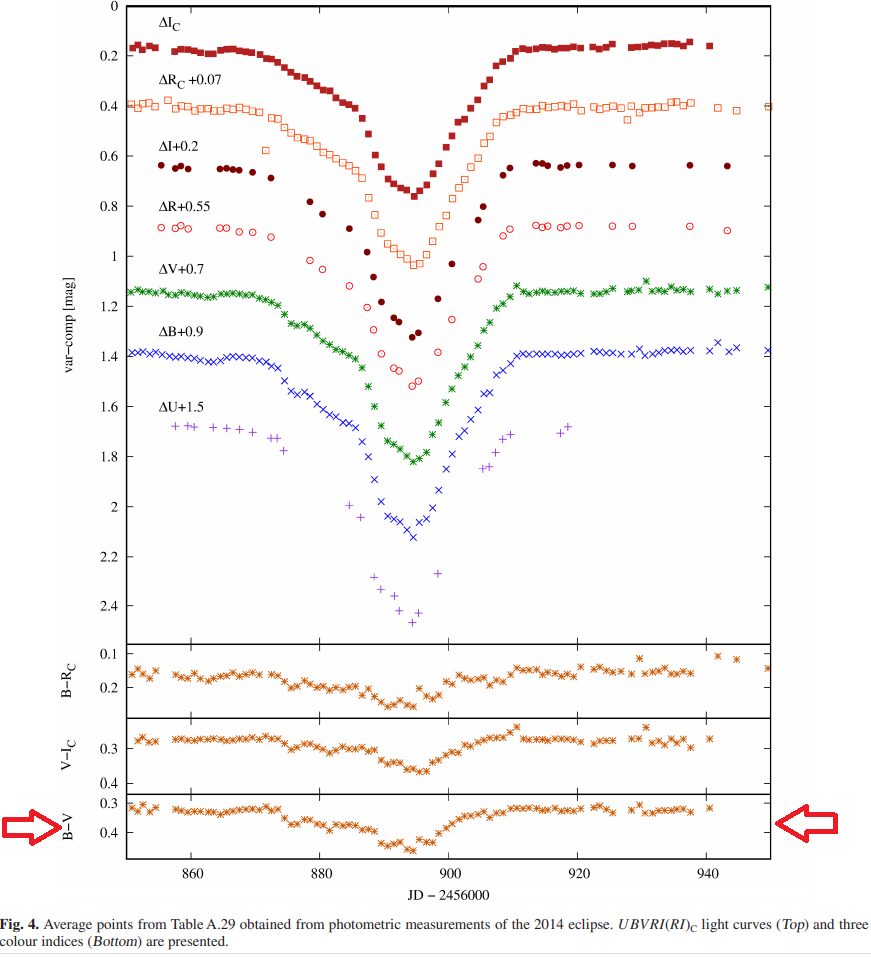 In the case of EE Cep eclipses are not grey. Color indexes like B-V change during the eclipses. Therefore it is not allowed to neglect this effect. For instance during the 2014 eclipse B-V index changed from ~+0,3 mag to ~+0,5 mag: